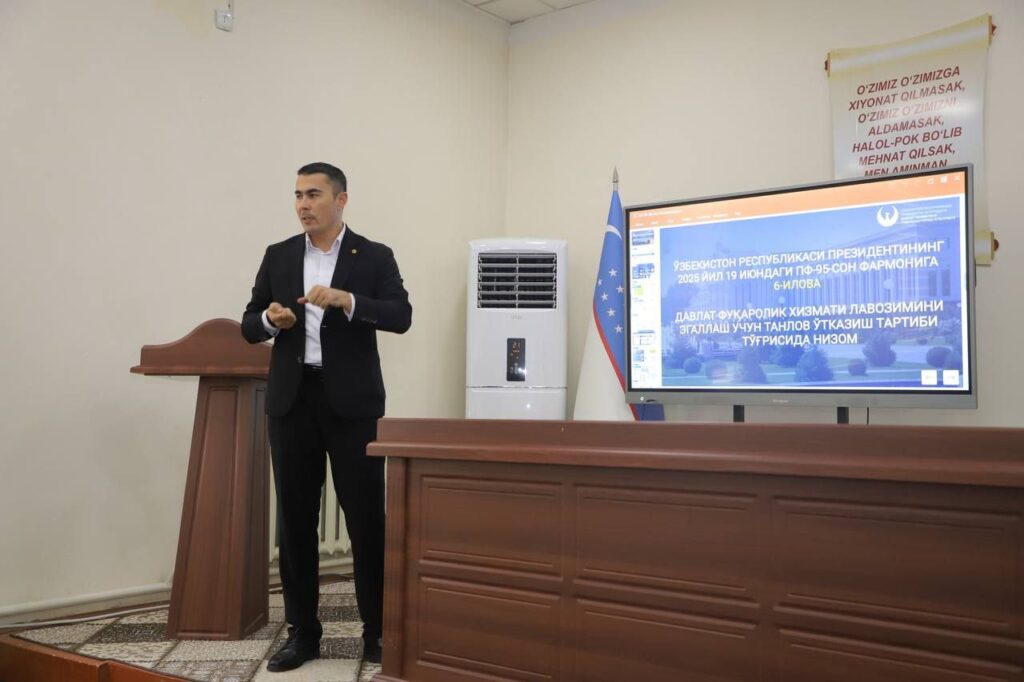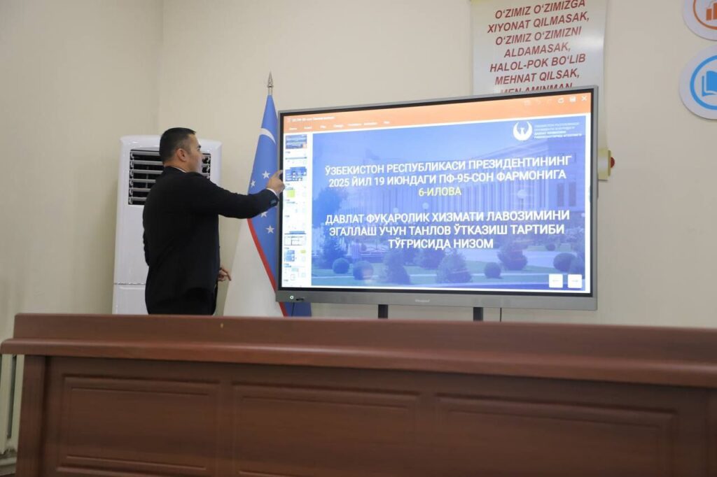 Tadbir davomida tanlovlarni amaldagi qonunchilikka muvofiq o‘tkazish tartibi, komissiyalarning yangi tarkibini shakllantirish, shuningdek, davlat fuqarolik xizmati lavozimlari uchun malaka talablari va ularni elektron platformaga kiritish bo‘yicha batafsil ko‘rsatma va tavsiyalar berildi.